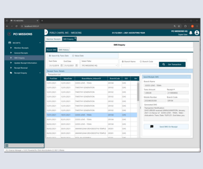 Custom-built financial management system for Perez Chapel International (PCI), covering tithes, welfare contributions, and comprehensive financial reporting.